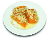 Oven baked pumpkin served with tahini and walnuts.